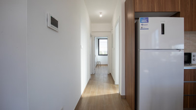 Fully equipped kitchen with fridge, oven, and washing machine.